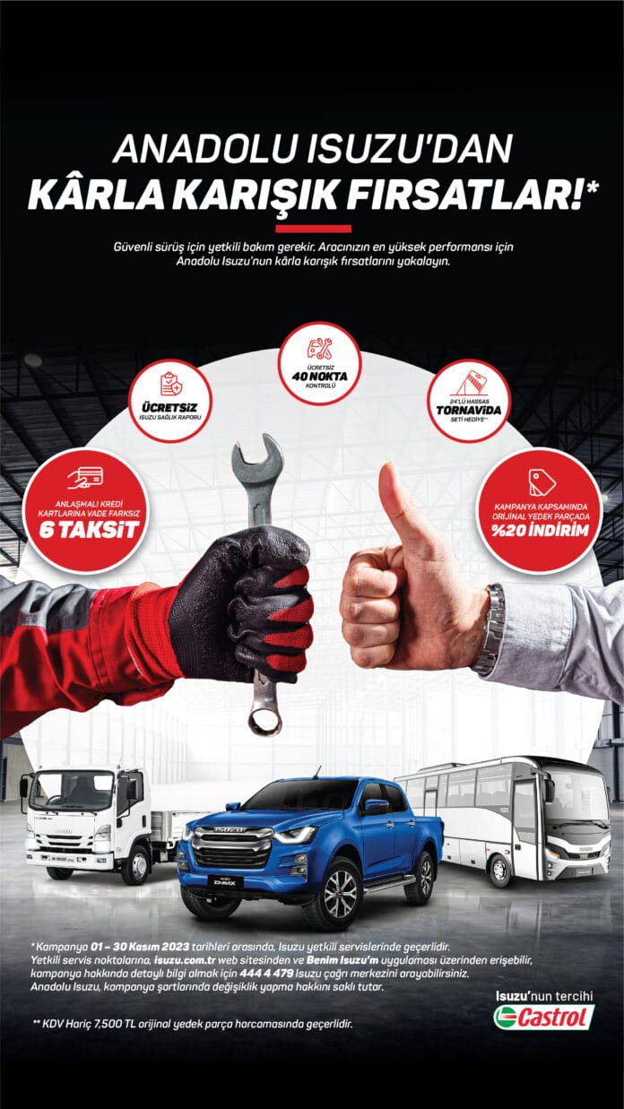 Türkiye’nin ticari araç markası Anadolu Isuzu, satış sonrası hizmetler kapsamında tüm Isuzu yetkili servislerinde geçerli bir kışa hazırlık kampanyası başlattı. Ticari araç sürücülerinin kış mevsiminde güvenli, bir sürüş deneyimi yaşamalarını desteklemeye yönelik kampanya çerçevesinde Isuzu ticari araç müşterilerine ücretsiz sağlık raporu ve 40 nokta kontrolü, anlaşmalı kartlara 6 taksit ve yüzde 20 indirim gibi avantajlar sunuyor.