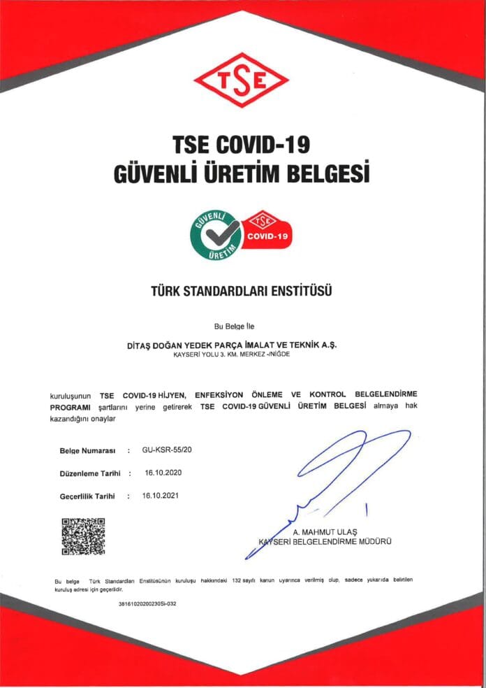 Türk Standartları Enstitüsü (TSE), pandemi sürecinde sanayi işletmelerinin, COVID 19 risklerini eksiksiz bir şekilde yönetmeleri ve gerekli önlemleri alarak çalışanlarının konu hakkında farkındalıklarını arttırma amacı ile yayınladığı kılavuzda gerekli şartları yerine getiren kuruluşlara “Covid-19 Güvenli Üretim Belgesi” vereceğini duyurmuştu. Ditaş’ın Covid-19 pandemisine ilişkin olarak yürüttüğü çalışmalar, Türkiye Standartları Endüstri Kurumu’nun (TSE) denetimi ile tescillendi ve Ditaş, TSE Covid-19 Güvenli Üretim Belgesi’ni almaya hak kazandı.