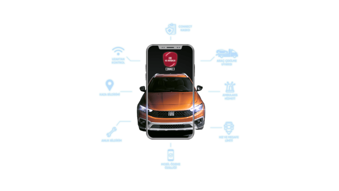 Müşterilerinin mobilite deneyimlerinde kolaylık, güven ve akıllı sahiplik yaratan Connect, FIAT sahiplerinin pek çok alanda hayatlarına dokunuyor. Müşteri deneyimini sürekli olarak yukarıya taşıyan Connect, kullanıcılarına Uzaktan Kapı Açma Kapama, Bagaj açma, Kaza Riski Yüksek Nokta Bildirimi, Çekilme Uyarısı, Hız ve Mesafe Limiti, Araç Arıza Araması, Araçtan İnmeden Akaryakıt ödeme özelliği, Yakıt, Lastik basıncı ve Akü Durum Bilgisi gibi fonksiyonları da sunuyor. Ayrıca kasko poliçelerinde “Akıllı Fiyatlandırma” dönemini başlatan FIAT, Connect Kasko uygulamasıyla sürüş puanı ve kullanılmayan güne göre FIAT sahiplerini ilave faydalarla buluşturuyor.