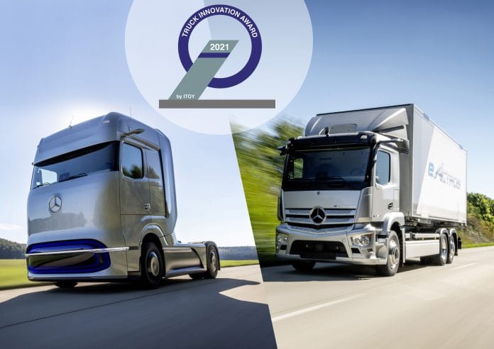 International Truck of the Year (IToY – Uluslararası Yılın Kamyonu) jürisinin verdiği karara göre, elektrikli geleceğin en yenilikçi kamyonları Mercedes-Benz yıldızı taşıyor. Jüri, prestijli 2021 Kamyon İnovasyon Ödülü’nü Mercedes-Benz’in iki elektrikli kamyonu olan batarya elektrikli Mercedes-Benz eActros’a ve yakıt hücreli konsept araç Mercedes-Benz GenH2 Kamyon’a verdi.